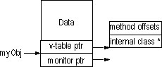 In the design of the native code interface in the Microsoft VM for Java, we have addressed many of the implications of prior interfaces as discussed above. Internally, object references are pointers directly to the object. The following diagram describes the internal storage details of objects within the Microsoft native code model.